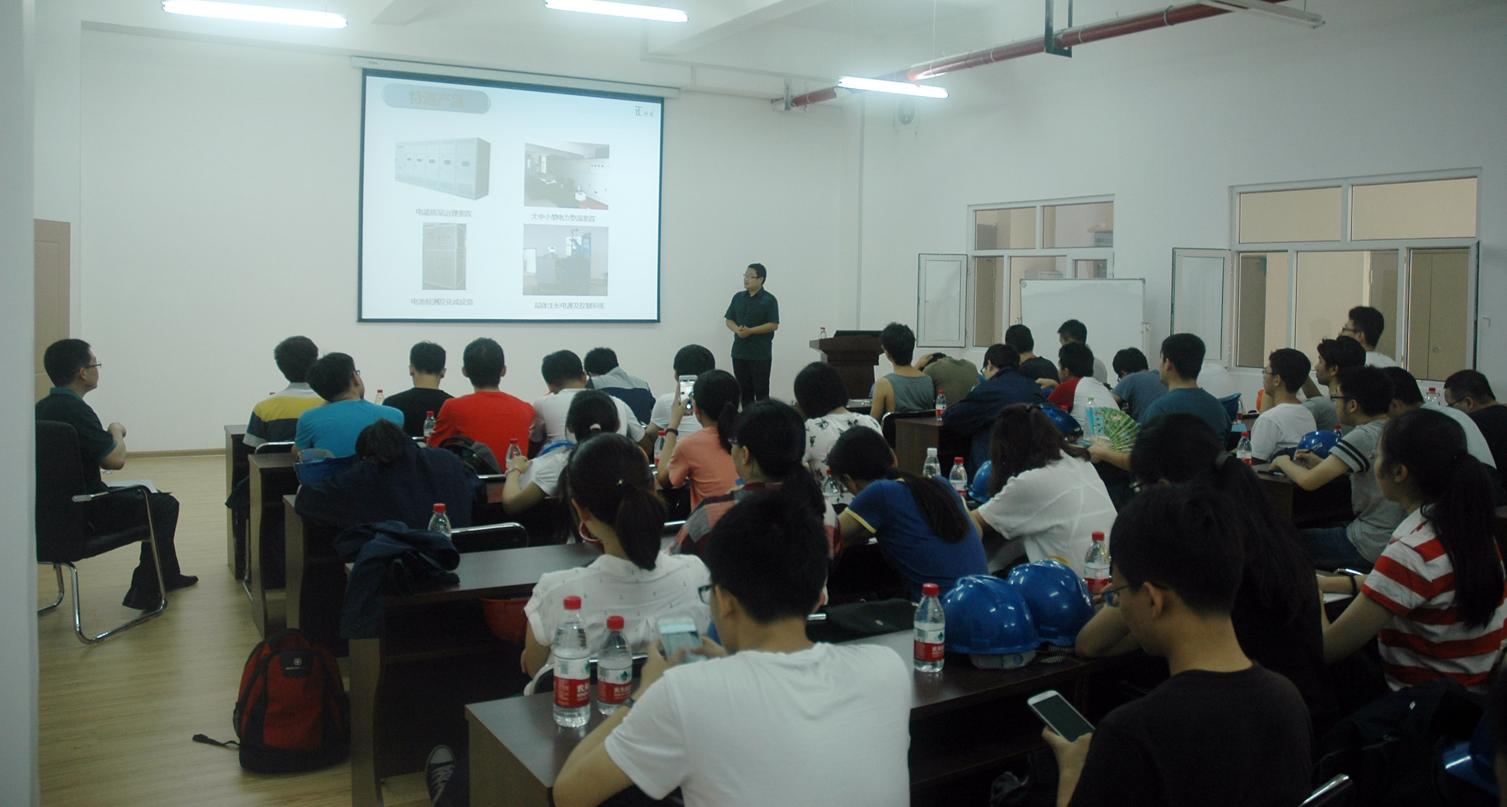 然后市場部牛明部長從電力電子行業(yè)發(fā)展、企業(yè)產(chǎn)品及服務(wù),以及未來同學(xué)們關(guān)心的就業(yè)方向幾個(gè)方面給同學(xué)們做了詳盡的講解。聽完精彩的講解后由市場部牛明部長、品質(zhì)部張超部長、技術(shù)部孫筱琳部長、技術(shù)部劉娜工程師分組帶領(lǐng)學(xué)子參觀了企業(yè)的研發(fā)中心,研發(fā)實(shí)驗(yàn)室,生產(chǎn)裝配車間以及檢驗(yàn)驗(yàn)收等方面,全面展示了公司的技術(shù)實(shí)力及產(chǎn)品服務(wù),在電能質(zhì)量治理、智能電源、蓄電池周期治療等領(lǐng)域的應(yīng)用做了全面系統(tǒng)的介紹,讓同學(xué)們對自己在大學(xué)里書本里面的知識有了更系統(tǒng)化和具體化的認(rèn)知。