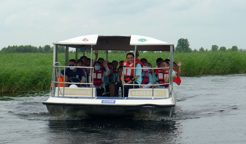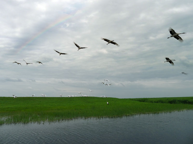 翌日,集體來到黑龍江扎龍國家級自然保護區(qū)觀看丹頂鶴。彩虹與仙鶴齊飛,湖水共長天一色。大家眼睛望著飛舞的丹頂鶴,心里想著的卻是鐵鍋燉大鵝。